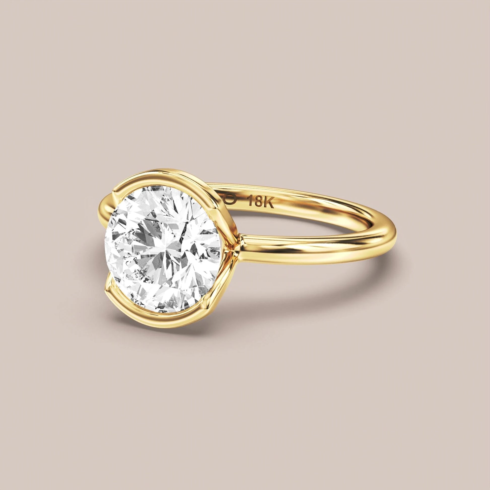 A half bezel-set solitaire — metal wraps partially around the centre diamond, exposing the sides of the stone for a modern, open look while keeping a secure hold. A unique approach to a stable, long-wearing design. Built on a classic solitaire setting with a 2mm band, designed for daily wear and made to pair with any wedding band. Pictured with a 2mm band and a 2-carat centre stone. All rings are customizable and built around your diamond — shape, size, and gold are yours to choose.